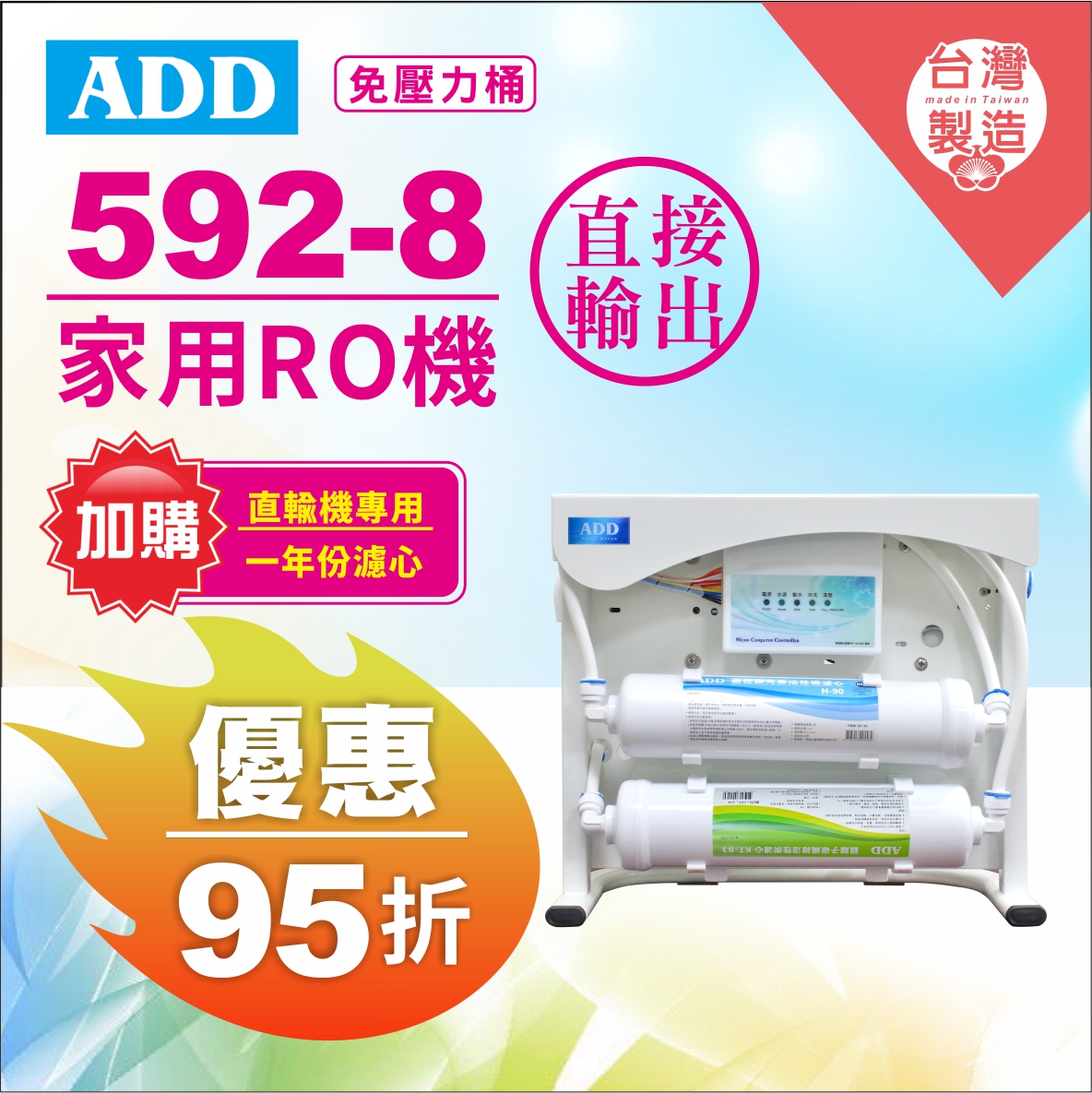 1.ADD-592-8 增量版:採用800G濾心,適合8人以下家庭,每日出水量可達800加侖,每分鐘出水量可達2公升